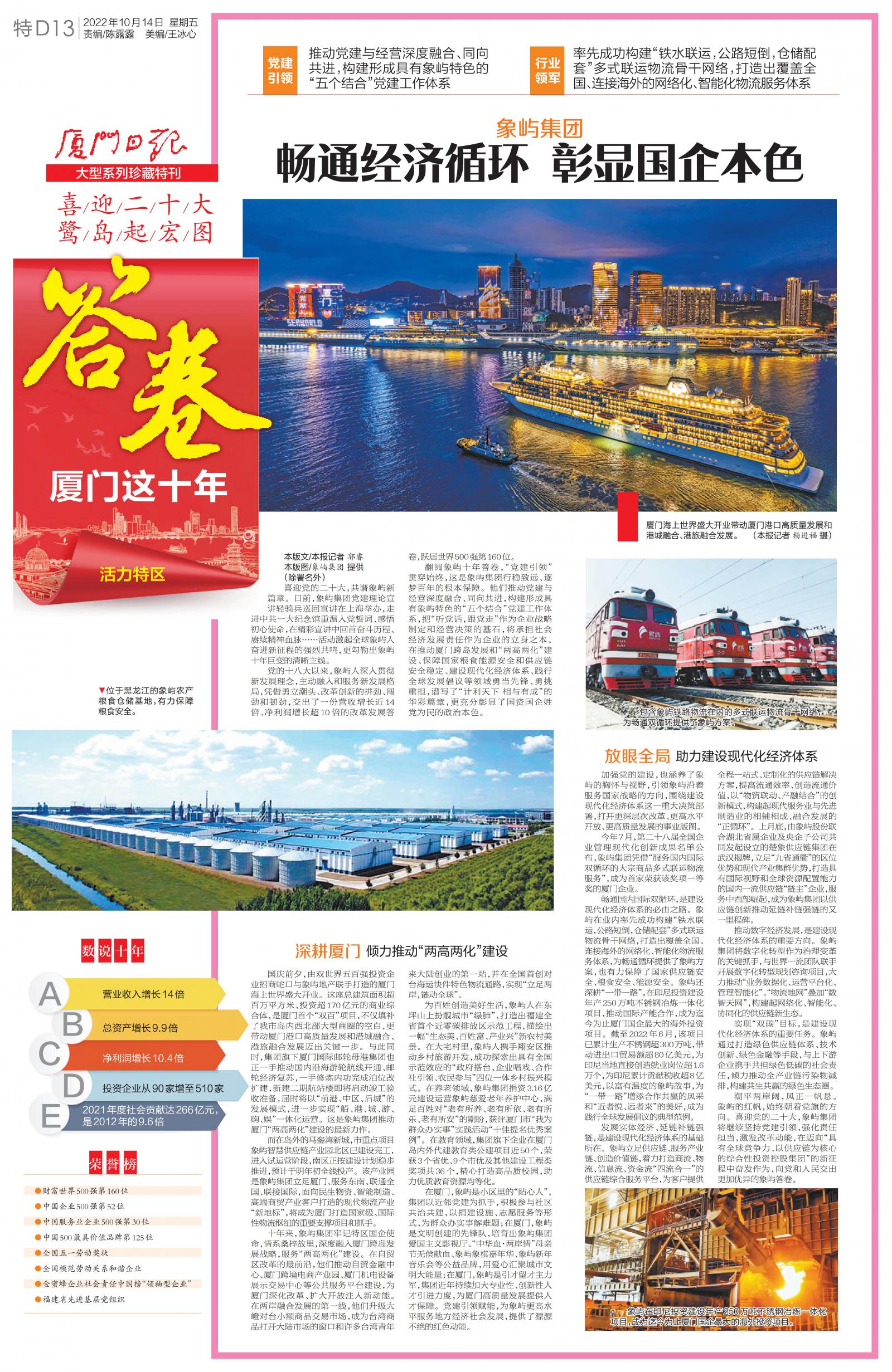 編者按:這10年,我們始終沿著習(xí)近平總書記指引的方向奮勇向前;這10年,我們奮力書寫高質(zhì)量發(fā)展亮麗答卷。今天,廈門日報推出大型系列特刊《喜迎二十大 鷺島起宏圖 答卷·廈門這十年》,專版報道象嶼集團堅持黨建引領(lǐng),深耕廈門傾力推動“兩高兩化”建設(shè),放眼全局助力建設(shè)現(xiàn)代化經(jīng)濟體系的精彩答卷。現(xiàn)全文轉(zhuǎn)載如下。