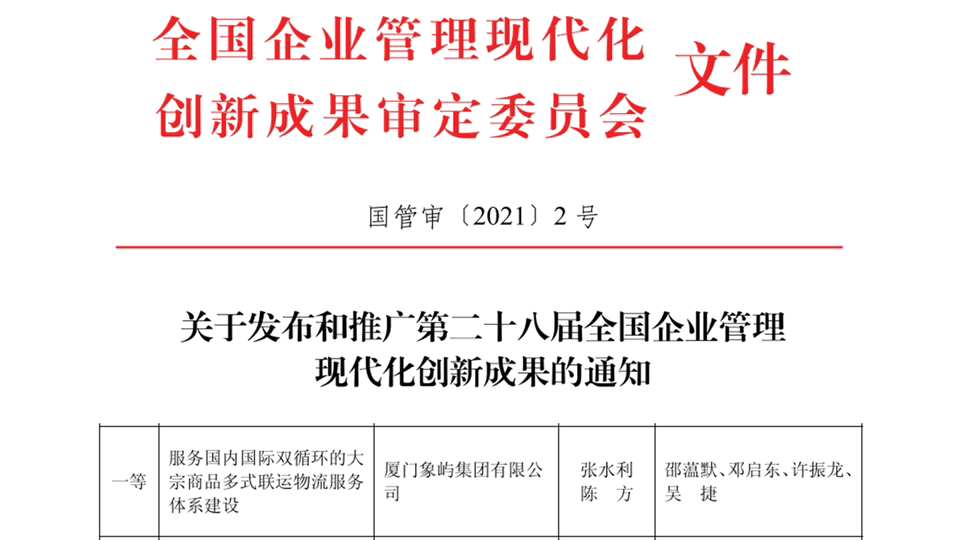2022年,第二十八屆全國(guó)企業(yè)管理現(xiàn)代化創(chuàng)新成果名單發(fā)布,象嶼集團(tuán)憑借《服務(wù)國(guó)內(nèi)國(guó)際雙循環(huán)的大宗商品多式聯(lián)運(yùn)物流服務(wù)》榮獲一等獎(jiǎng),成為廈門首家獲評(píng)該獎(jiǎng)項(xiàng)一等獎(jiǎng)的企業(yè)。11月,倫敦設(shè)計(jì)獎(jiǎng)(London Design Awards)結(jié)果出爐,上海天安象嶼西江悅榮獲建筑設(shè)計(jì)類別最高獎(jiǎng)金獎(jiǎng),福州象嶼國(guó)貿(mào)星璟原獲展示空間銀獎(jiǎng)。此外,2020-2021年度全國(guó)企業(yè)文化優(yōu)秀成果一等獎(jiǎng)、2022金蜜蜂企業(yè)社會(huì)責(zé)任·中國(guó)榜“ESG競(jìng)爭(zhēng)力·責(zé)任采購(gòu)”獎(jiǎng)、福建五一勞動(dòng)獎(jiǎng)狀、福建省優(yōu)秀企業(yè)家等重磅獎(jiǎng)項(xiàng)也先后花落象嶼,凸顯社會(huì)對(duì)象嶼的高度認(rèn)可。