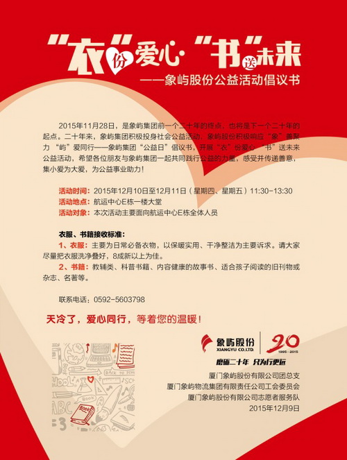 鷺島雖已降溫,善行卻讓人溫暖無比。集團倡導開展“象嶼公益日”活動,旨在讓愛在每位象嶼人的心間徜徉,成為長期的堅守和正能量;也希望能讓象嶼在社會發(fā)光,與社會各界一道,將公益融入日常的一舉一動。