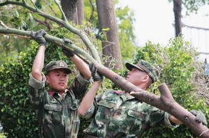 9月19日,子弟兵來了。這群已經(jīng)為廈門奮戰(zhàn)四天四夜的親人,來到廈門國際航運(yùn)中心,攜手象嶼人,一同清運(yùn)兩處景觀公園的斷樹殘枝。