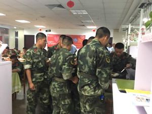 為感謝這群最可愛的人,我們?cè)趩T工餐廳精心準(zhǔn)備了營養(yǎng)豐盛的愛心餐:紅燒肉、熏鴨,都是分量十足的硬貨;配菜新鮮,煲湯清爽,確保著營養(yǎng)的均衡;酸奶和水果則代表了我們滿滿的心意?!霸偃ゼ訋讐K肉,再去添些飯。”我們熱情招呼著子弟兵們,希望他們能多恢復(fù)些體力,多保重身體。