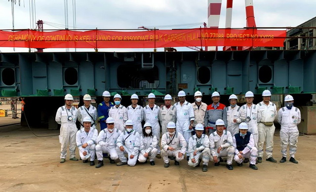 同日下午,象嶼海裝分別為日伸海運(yùn)株式會(huì)社和日本洞雲(yún)汽船公司建造的63500載重噸系列散貨船ZZ088和ZZ069在船塢舉行鋪龍骨儀式。