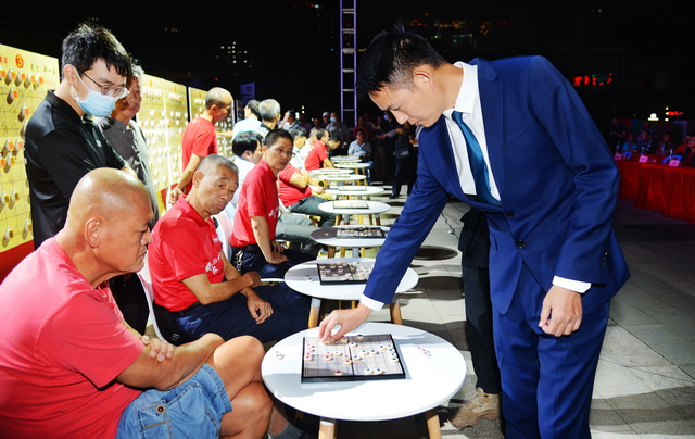 主辦方還邀請(qǐng)福建省唯一的中國(guó)象棋特級(jí)大師鄭一泓與獲獎(jiǎng)選手進(jìn)行一對(duì)二盲棋表演賽和一對(duì)十車(chē)輪表演賽,吸引大量象棋愛(ài)好者和市民駐足觀看。
