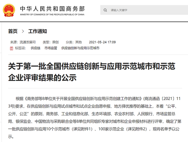 商務(wù)部此次公示的“全國供應(yīng)鏈創(chuàng)新與應(yīng)用示范城市和示范企業(yè)評(píng)審結(jié)果”,是商務(wù)部、工業(yè)和信息化部、生態(tài)環(huán)境部、農(nóng)業(yè)農(nóng)村部、人民銀行、市場(chǎng)監(jiān)管總局、銀保監(jiān)會(huì)、中國物流與采購聯(lián)合會(huì)等8單位共同組織專家對(duì)城市和企業(yè)申報(bào)材料進(jìn)行評(píng)審確定的結(jié)果。