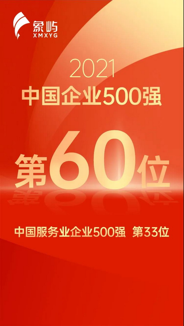 9月25日,中國(guó)企業(yè)聯(lián)合會(huì)、中國(guó)企業(yè)家協(xié)會(huì)發(fā)布2021年中國(guó)企業(yè)500強(qiáng)榜單,象嶼集團(tuán)以37483544萬元人民幣的營(yíng)收排名第60位,較去年前進(jìn)17位;在同期發(fā)布的“2021年中國(guó)服務(wù)業(yè)企業(yè)500強(qiáng)”中,象嶼集團(tuán)位列第33位,較去年前進(jìn)10位。自2007年參評(píng)榜單以來,象嶼集團(tuán)已連續(xù)15年登榜,排名年年躍升。