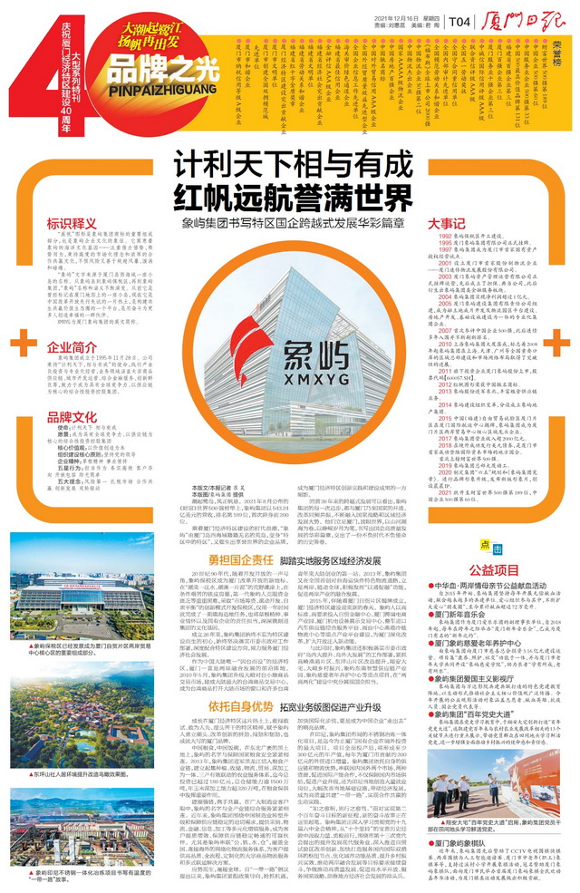 12月16日,《廈門日報》在“慶祝廈門經(jīng)濟特區(qū)建設40周年大型系列特刊”中,以《計利天下相與有成 紅帆遠航譽滿世界》為題,對象嶼集團進行了專版報道。