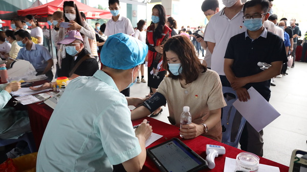 為在疫情常態(tài)化管控背景下保障活動(dòng)順利進(jìn)行,“紅馬甲”也成為昨天現(xiàn)場(chǎng)的另一道風(fēng)景。來(lái)自主辦單位的志愿者們?yōu)楂I(xiàn)血者搭起遮陽(yáng)棚,并引導(dǎo)他們戴好口罩、保持間距、有序排隊(duì)。象嶼集團(tuán)還為獻(xiàn)血者準(zhǔn)備了堅(jiān)果、花生牛奶等營(yíng)養(yǎng)補(bǔ)給以及感恩禮包。